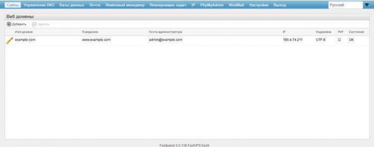 Fastpanel представляет собой панель для быстрого управления арендованным сервером. Она содержит следующие разделы: