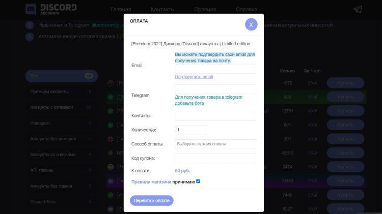Для того чтобы приобрести аккаунт или токены на сайте Discord-accounts.ru, необходимо выполнить следующие шаги.