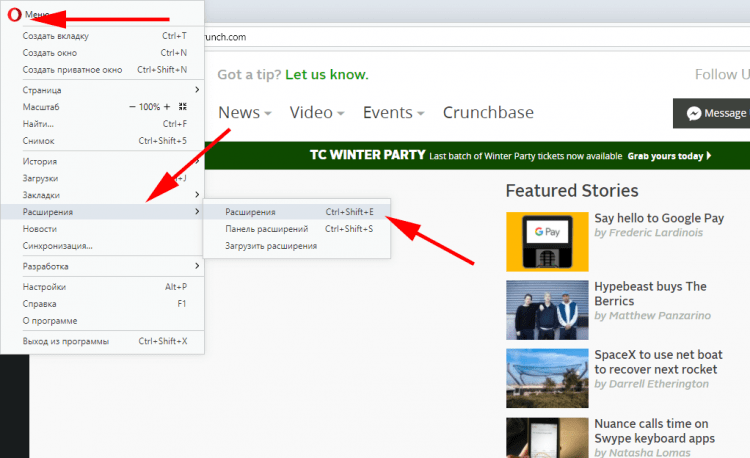 - Нажимаем на значок Оперы в левом верхнем углу → Расширения → Расширения