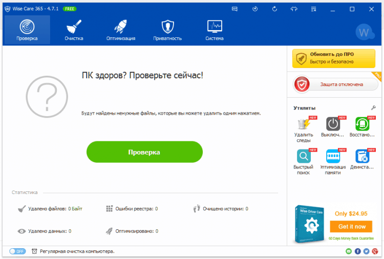 Скачать оптимизатор Wise Care 365 можно на официальном сайте разработчика. Wise Care 365 – это бесплатная программа для улучшения работы компьютера. Контролирует стабильность, производительность и безопасность системы.