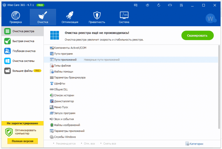 Оптимизатор очень прост в использовании, разобраться с управлением сможет даже неподготовленный пользователь. Wise Care 365 обеспечивает стабильную работу и ускорение компьютерных процессов. Имеет высокую скорость сканирования.